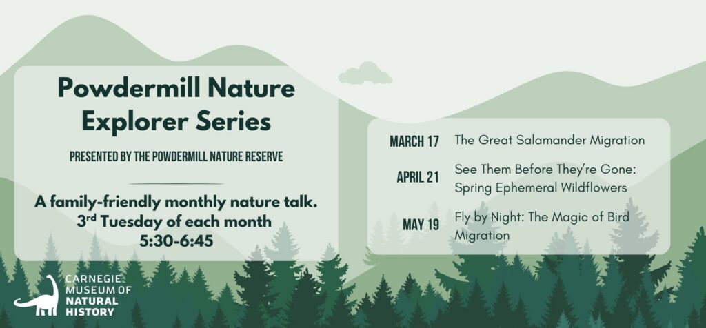 Explore the plants, wildlife, and natural systems of western Pennsylvania through this engaging, all-ages lecture series. Each month, scientists and educators from Powdermill Nature Reserve share insights into the forests, fields, streams, birds, mammals, insects, and native plant communities that shape our region. Learn how species interact, how habitats support biodiversity, and how ongoing research is helping us better understand and care for the landscapes around us.